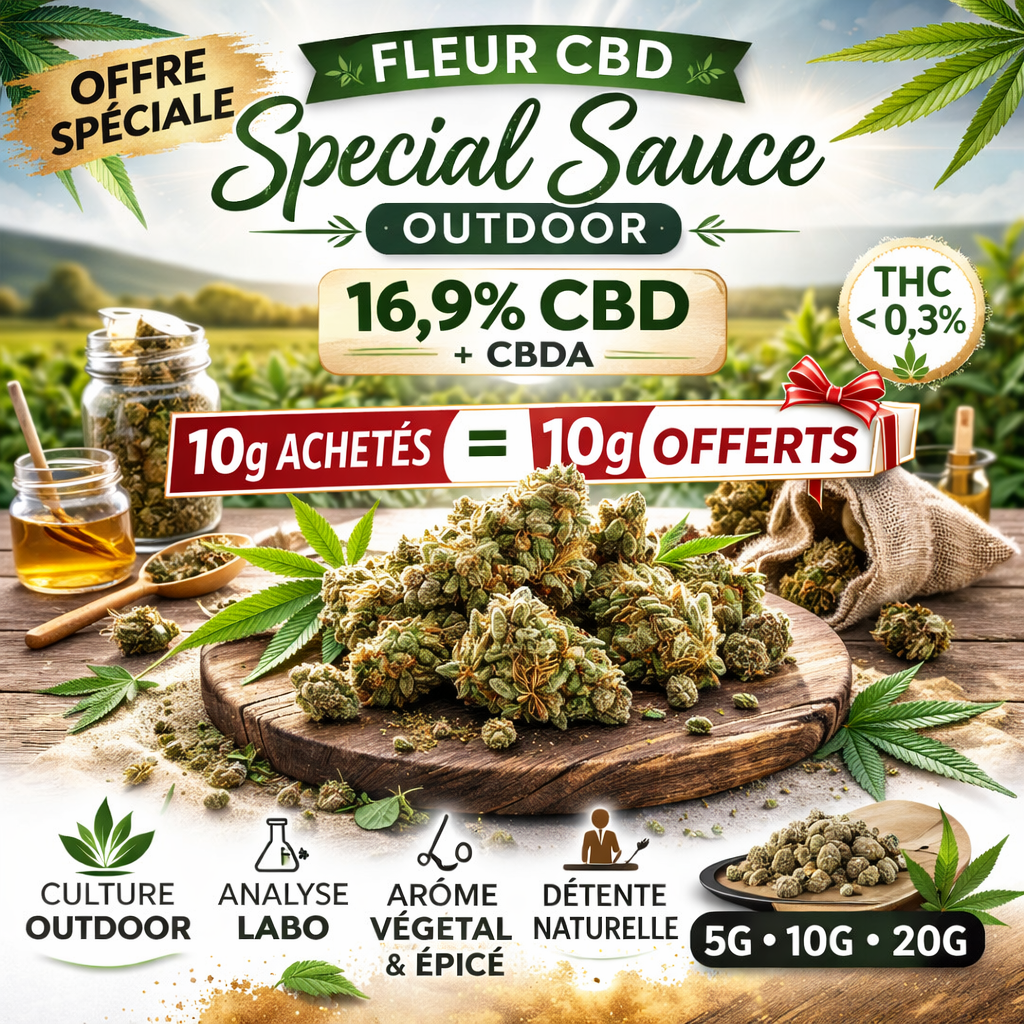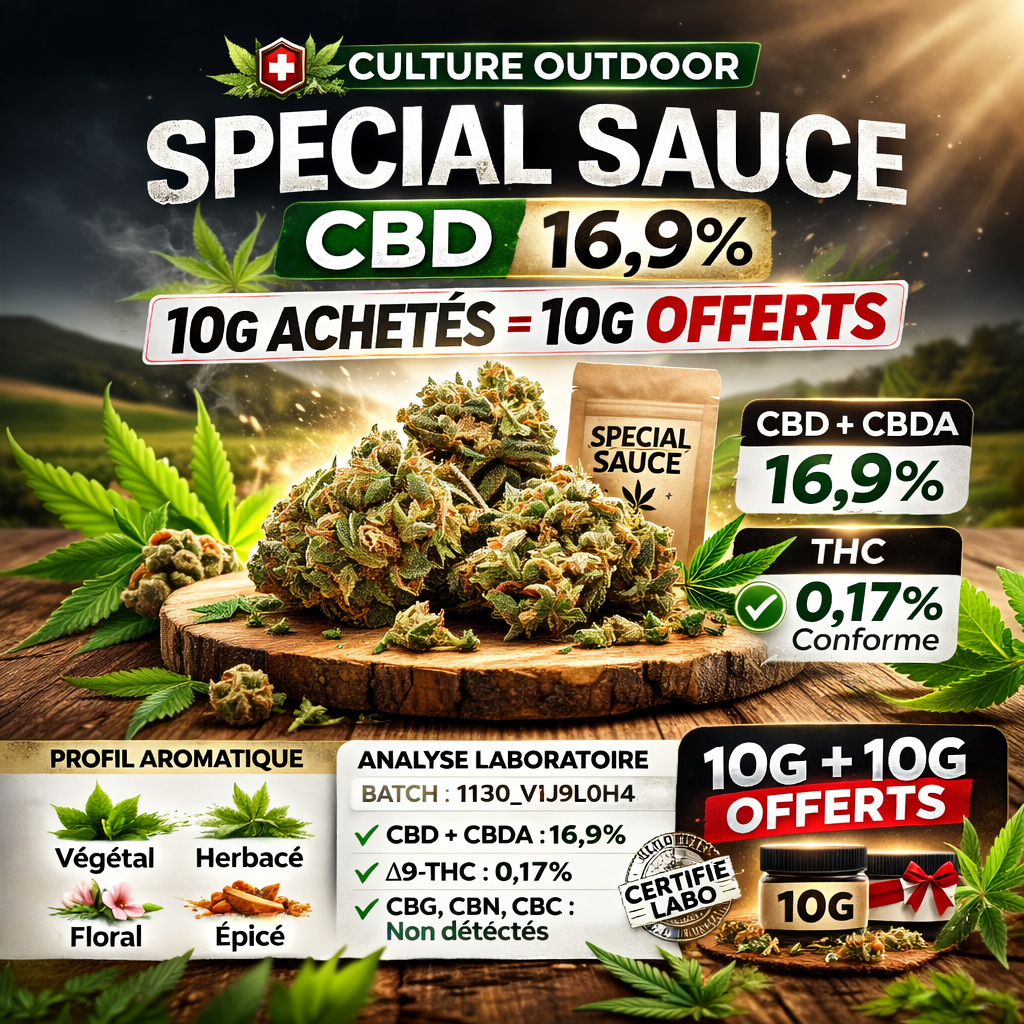 La Special Sauce CBD Outdoor revient chez MJ Store avec une offre exceptionnelle : 10g achetés = 10g offerts. C’est donc le moment idéal pour profiter d’une fleur outdoor naturelle à prix avantageux.