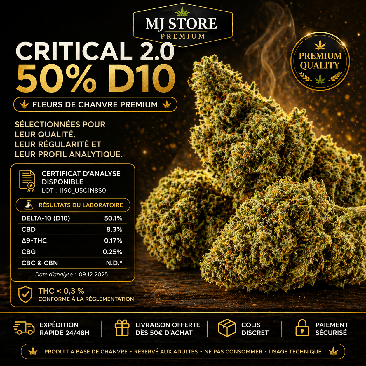 La Critical 2.0 50% D10 est une fleur de chanvre enrichie en cannabinoïdes, sélectionnée pour sa qualité visuelle et son profil analytique précis. Chaque lot est analysé en laboratoire indépendant afin de garantir transparence, conformité et traçabilité.