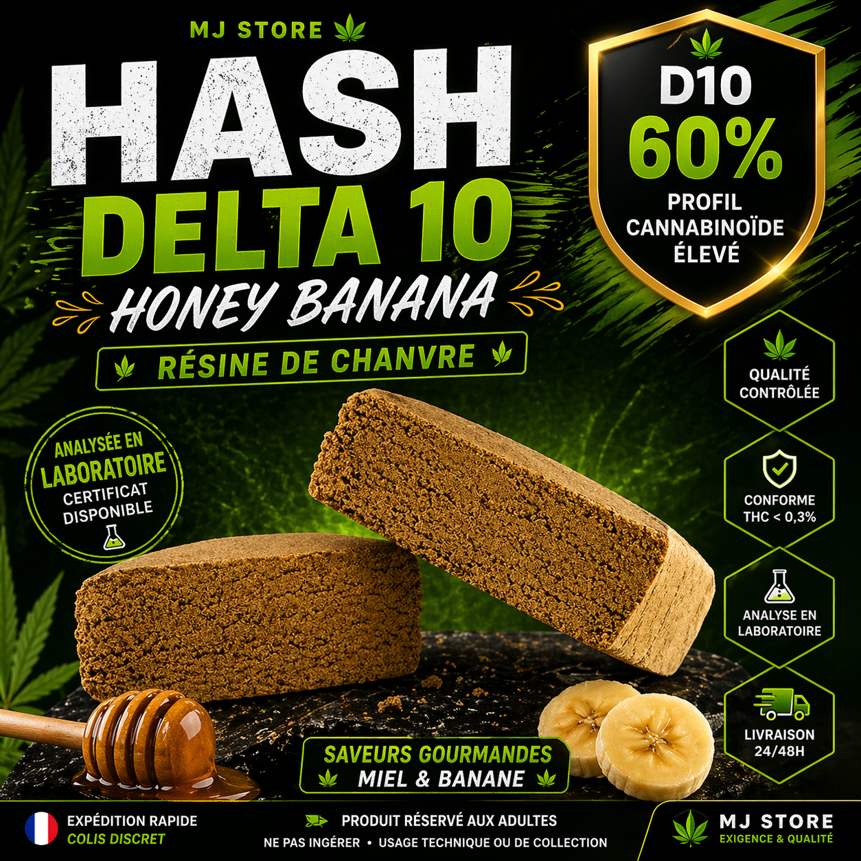 Le hash D10 60% Honey Banana est une résine de chanvre avec profil cannabinoïde mesuré en laboratoire.